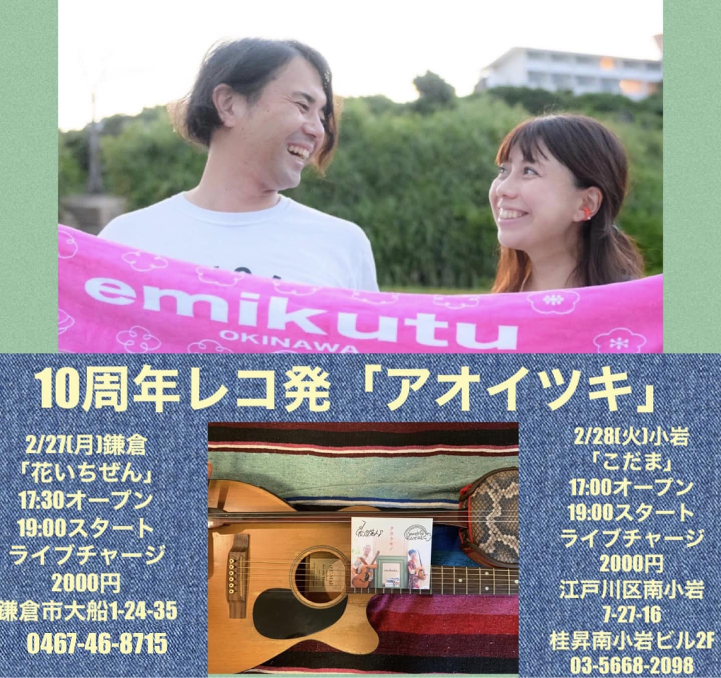 open 17:30 start19:00 charge 2000yen emikutu 2ndアルバムレコ発ツアー10周年ありがとう 「アオイツキ」 クラウドファウンディングを通して、沢山の方に応援いただきました。 ついに、emikutu 2ndアルバムを作る事が出来ました。 結成10年、結婚10年、長男も10歳になりました。 この先の10年も、2人で力を合わせて「みなさんと楽しめる音楽を」発信していきます。 これからも、よろしくお願いいたします。 emikutu 高良篤人 金子えみ ※演奏中は料理の提供を中断致します。 (18:30以降の注文はライブ開始までに提供できない場合があります。) ※指定席です。 花いちぜん 電話番号0467-46-8715 | |